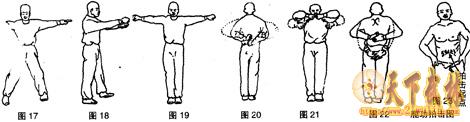 两手由两肩左右伸出,成一直线,掌心向下,如大字形状(图17)。两手平移至前方相交而覆,均为吸气。此时神意专注视手,其余仍注视丹田,吸气毕,两手变掌为拳,两脚收拢并立(图18)。随即两拳向后平分,同时呼气(图19)。两拳继续分向后方腰眼中间,左拳在上,右拳在下,拳背紧贴背脊,呼气乃尽,是为第九口气。保持姿势不变,再行呼吸九次,是为第十至第十八口气。