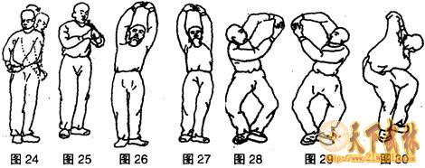 具体方法:身体直立,左脚跟抵右脚弓,成“丁”字形,双膝挺直,双手十指相交叉,手心向上,相叉的双手从右边髋骨处缓缓绕脐而至左髋骨处。注意,双手不能触及髋骨。动作开始即吸气,吸气毕马上呼气,是为第一口气(图24)。