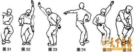 右肘直想前方,手指尖下平掌与肩齐,再尽力向后方平移(图33),身体亦随之扭转,此为吸气时间(图34)。
