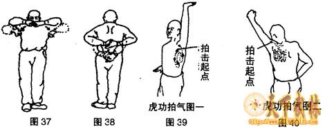 虎功拍气法与猿功、鹿功拍气法不同。自第四口气至第九口气止为拍击时间,拍击部位为自腋下起,沿膀及肩击之,呼吸如故。即学者不管呼吸如何,均有节奏地进行拍击,以四十下为度。又自第十一至第十九口气间进行拍击,则自后肩沿膀至腋与前所击成半环形,仍不问呼吸缓急,而有节奏地进行急拍,以四十至六十次为度。拍击用的砂袋较拍腹部的重量要轻,约二市斤左右(图39,图40)。