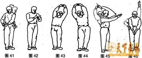 1.熊功为五禽图之第四部功法,共呼吸十九口气。第一、二口气姿势于虎功相同(图36,图37)。第三口气吸时仍以相叉之两手心反转向下做拱手状上伸(图38—图44)。