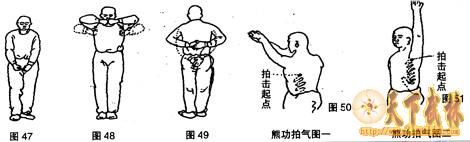 拍法略与虎功相同。第四至第八口气时,拍击腰眼。第十至第十八口气时,则拍击肋边,仍以40至60次为度,左右运动时均一样(图50,图51)。
