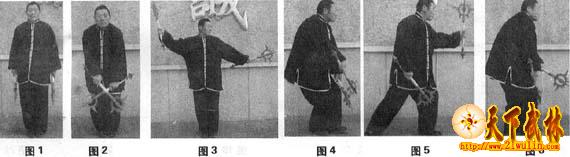 身体直立呈立正姿势,双手各持一鎲自然垂于身体两侧,目视前方(图1)。静立片刻,右手在前,左手在后,双手持鎲在腹前交叉,随之,丹田内扣,两腿微曲,头微仰呈束身势(图2);上动不停,右手持鎲向身体右上方划弧上举,左手握鎲向身体左前方平举,头向左转,目视左手鎲(图3)。