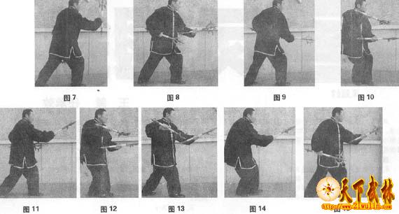 右脚后退一步,身体左转90度,重心移于右腿,左脚置于右脚前呈左虚灵步束身势,右手在前,左手在后,双手持鎲随身体下势交叉下押于腹前(图4)。上动不停,左脚向前迈进一步踩出呈左虎步,右手持鎲回钩于右腰侧,左手握鎲,鎲头沿逆时针方向向前向刺出(图5);承接上势,左脚前寸,重心移于左腿,右脚过左脚向前迈进一步置于左脚前呈右虚灵步束身势,右手在前,左手在后,双手持鎲随身体下势交叉下押于腹前(图6)。上动不停,右脚向前迈进一步踩出呈右虎步,左手握鎲回钩于左腰侧,右手持鎲,鎲头沿逆时针方向向前向刺出(图7)。