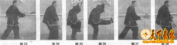 左脚前寸,重心移于左腿,右脚过左脚向前迈进一步置于左脚前呈右虚灵步束身势,右手在上,左手在下,双手持鎲在腹前交叉下押(图34)。上动不停,右脚抬起置于左膝内侧呈左金鸡独立势,双手持鎲,手腕翻转,交叉上举于头部上方(图35),随之,右脚向前蹬出(图36),劲达脚跟,紧接,右脚向前落地踩出呈虎步,双手持鎲向前向下劈击(图37)。承接上势,右脚前寸,重心移于右腿,左脚过右脚向前迈进一步置于右脚前呈左虚灵步束身势,右手在上,左手在下,双手持鎲在腹前交叉下押鎲(图38);上动不停,左脚抬起置于右膝内侧呈右金鸡独立势,双手持鎲,手腕翻转,交叉上举于头部上方,随之,左脚向前蹬出,劲达脚跟(图39),紧接,左脚向前落地踩出呈虎步,双手持鎲向前向下砍击(图40)。