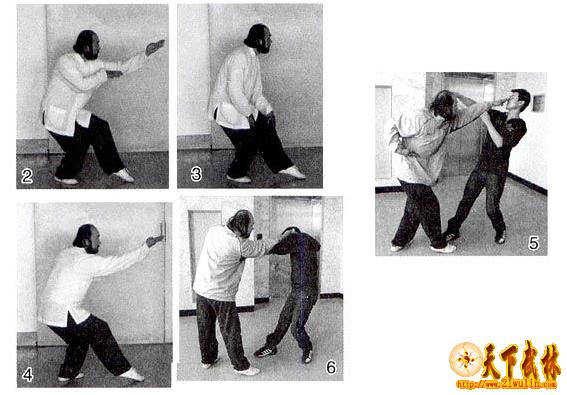 守住中线进攻中线,除为了达到攻击对方重要部位及人体的重心的目的 外,还能自然形成一种使对方不易躲避的有利态势。当你面对一名强悍、高速冲前的对手时,你的脑海可能有几种应付招法,但在搏斗中是没有时间思考对策的,也 很难有时间仔细做出使用哪一种招法去应对的决断。最有效的应对招法就是凭本能的反应和直觉去进行攻击、防守,这些无条件的反射动作,是不挡不架(挡架被动 挨打),“直出直入”直线进攻,护住自己的怕打部位中线(主要面部),利用直出掌法“挤滚穿”猛力进入,以快取胜(图5),在进攻中线时防守,在防守中线 时进攻。“一稳、二准、三毒、四狠,脚踏中门往里钻”,专打敌人中线上的要害部位,如百会穴、面部、咽喉、心窝、丹田、裆部等。