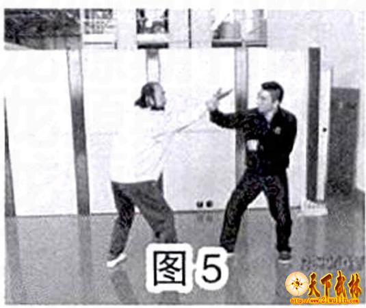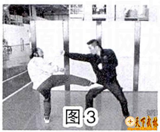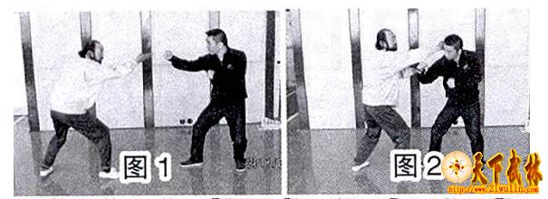 要点:踢腿如走路,穿掌紧贴敌方右臂内侧,挤滚化解敌来拳,守中打中。