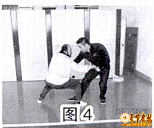 捋带横摔掌:对峙中,敌突然出右拳击我面部,我迅速前阳手回缩,用后阴手捋带敌拳(图2),同时以右手背为着力点横抽、击敌面部,随后迅速用右脚尖踢击敌裆部(图3)。随后我急落步、左手捋带敌拳,同时右拳击敌心窝、丹田穴(图4)。