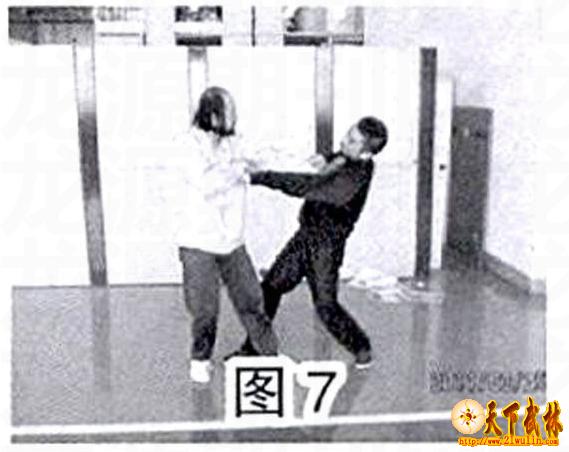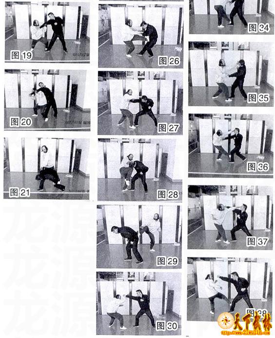 ‘对峙中(图22),敌突然出左拳击打我面部,我迅速下蹲闪展上步,躲过来拳同时用左掌以掌心为着力点击打敌裆部(图23)。紧跟上左步,右 掌捋带敌防打手,同时用左平拳击打敌咽喉(图24),后紧跟上步用双手捋带敌防打手(图25),同时用正踹腿踢击敌裆部(匡26)。 br>