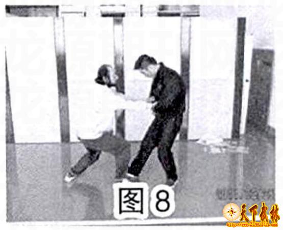 对峙中(图1),我用引手掌击敌面部迫使敌挡架(图16),同时我迅速偷、投步插入敌前腿后,左手捋带敌防打手,同时右臂屈肘以肘尖为着力点横向击敌心窝,可将敌别倒(图17)。
