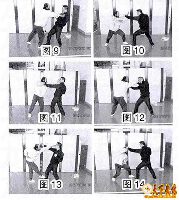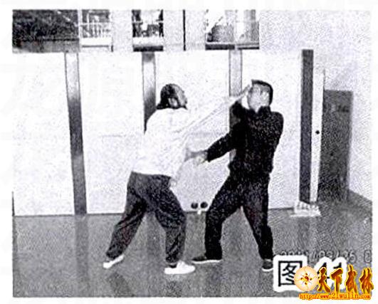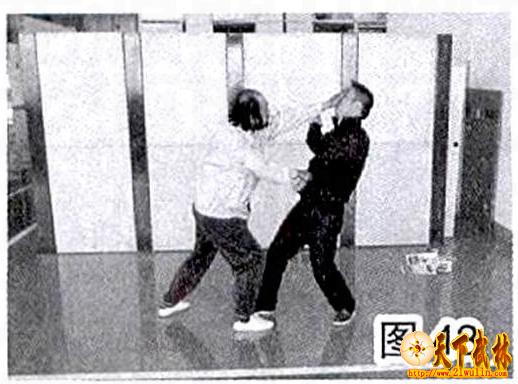 手脚并用法:双方对峙时(图1),敌突然出右拳击我面部、我迅速用后阴手紧粘敌拳内侧、以指尖为着力点挤滚穿击敌双眼,同时抬右脚踢击敌胫骨(图13)。