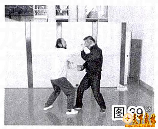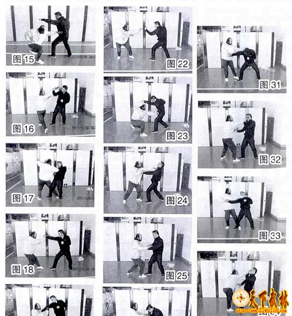 双方对峙中(图22),敌突然出左拳击我面部,我迅速下蹲用右手拍击敌拳,同时用左手以掌背为着力点,击打敌肋部(图15)。