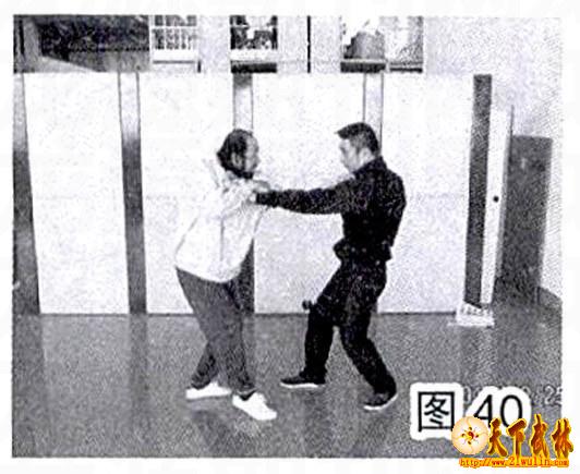 随后我迅速缩身,起脚踹击敌胫骨(图38),紧跟落步,左手捋带敌防打手,同时右掌以掌心为着力点,横掮敌耳穴、太阳穴、山三穴(图39)。 随之右手捋带控制敌防手,同时左手变平拳击打敌咽喉(图40)。不停滞,左手回捋带敌防打手,同时用右手以掌心为着力点拍击敌面部(图41)。