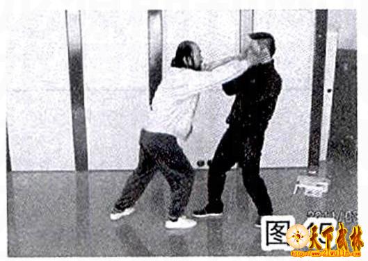 对峙中(图1:敌突然出拳击我面部,我迅速前阳手叵缩,用手捋带敌拳,同时用右手以掌轮为着力点劈击敌方右耳穴、太阳穴、山三穴(图27)。 紧跟用右手回捋抓住敌头发,同时上步,抬右膝以膝盖为着力点击打、重创敌面部(图28),随后顺势紧跟上步在敌身后,用右脚猛踹敌方(图29)。