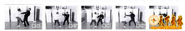 对峙中(图1)我用引手击敌面部,迫使敌挡架(图47),然后左手迅速回捋带敌防打手,同时右手以掌背为着力点击打敌面部(图48),紧跟缩 身下蹲,右手回捋带敌防手,同时左手以拳尖为着力点,击敌心窝、丹田穴(图49)。不停滞,我顺势往敌怀里钻,同时屈左臂以肘尖为着力点击敌心窝(图 50)。