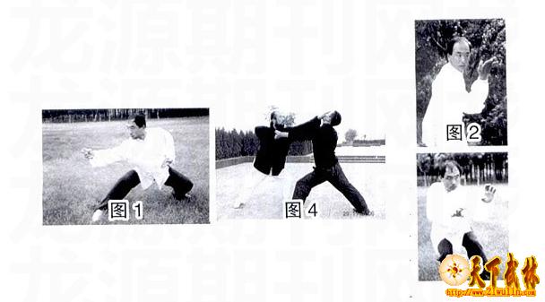 击技中,敌方中线守护严密、我无从下手突破中线,如果硬闻强攻,则自己很有可能被击中,故必须运用心计、智慧。先用引手掌虚晃攻击其“中 门”,然后左右闪展迂回侧击“外门”。所谓外门,也就是对方出手之外侧。“捋带勾拿”对方前臂之上,击打其左右太阳穴、耳穴等,或从其手臂之下“拍按挑” 击打其软肋部等外门。但意仍在中线,在左右晃打中寻找机会、击敌中线,一招取胜(图4)。拳谱中:“敌击我上我击中,敌击我中我取中”正是这个含义。