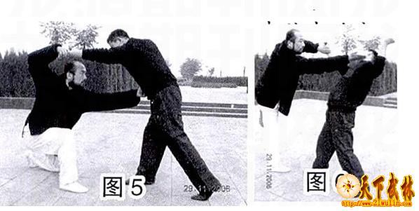 五行通背中拳强调臂长击远,一手二手连三手变六手。在散手对抗中,要充分利用中拳臂长省时、省力,攻击距离短、速度快,命中率高的优势,贴身 发劲、打中没有预示,不暴露攻击意图,手在何处便从何处击出。中拳击敌、每有真手出击,必有假手相佐,真假难分、狡诈变化,打着对手是真、打不着是假,就 算对手擅长脚法攻击,如果对手进攻的拳、达不到我一臂之长的中线范围内,那么他就无法打到我,因为他的拳也只有一臂之长。但他如果为了打我,而进入了我的 中线一臂之长的范围内,那么我就可以用探肩送背、臂长击远之特点,先将其击倒(图6)。所以,五行通背在出手走势中,非常讲究“两只胳臂似皮鞭,中拳出手 似暗箭”技击特点的发挥。