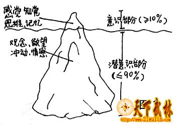 所谓的潜意识就是潜藏在我们一般意识下的意识。潜意识中的主要内容是个人的原始冲动、本能、欲望和情感等,其内聚集了人类数百万年来的遗传基因层次的资讯,囊括了人类生存最重要的本能与自主神经的功能,即人类过去所得到的所有最好的生存情报都蕴藏在潜意识里。日本著名医学家春山茂雄称它为“祖先脑”。精神分析学说的创始人弗洛尹德将人的精神活动比喻为海洋中的冰山,意识是冰山露出水面的一角,而在水面下还有一个看不见的巨大冰山底部,这便是潜意识(图1)。