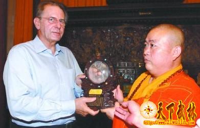 | (少林寺方丈释永信(右)向国际奥委会主席罗格赠送礼品) |