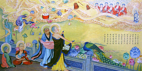舍利弗,我再告诉你,在极乐国里,空中时常发出天乐,地上都是黄金铺饰的。有一种极芬芳美丽的花称为曼陀罗花,不论昼夜没有间断地从天上落下,满地缤纷。那个国里的众生每天早晨起来,用他们的衣祴盛装各种天华,送到十方世界供养诸佛;到吃饭的时候再回来。饭后随意地散步行道。舍利弗,极乐国成就了如上所说的功德庄严。
